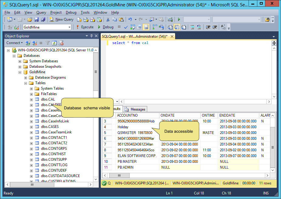 In the example below, we are using SQL Server 2012, however, server versions also play no role on the functionality of DbDefence. All versions of SQL Servers released from 2005 to 2012 are compatible with DbDefence. Below you will see a basic overlay of what to expect when you log into DbDefence as a super user. We have highlighted the fact that other users typically have access to the database schema (table structures).