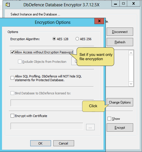 Some customers have requirements to encrypt data and do not restrict access for any applications. Just let everything run as before but with encrypted files on the disk. In this case, set extra option before encrypting the database:
