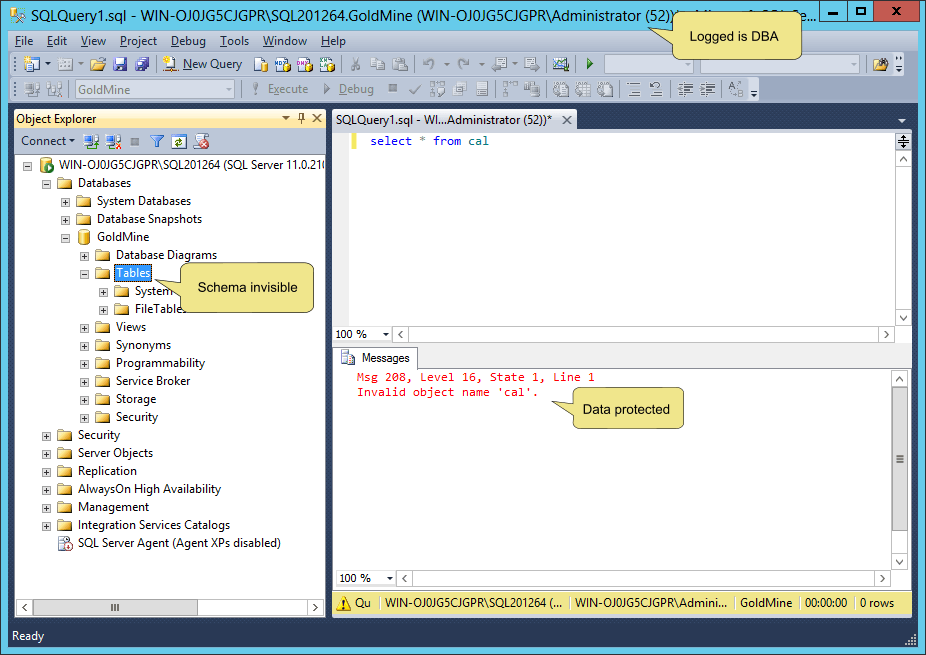 Now that you have successfully encrypted your database, go back to SQL Server Management Studio and try to access your database as the most privileged account. Look! The database structure is now completely hidden! Trying to select any data from the protect table now returns as an error, but the data is still there, completely intact! And the best part is, this level of database protection works for ALL network applications, not just SSMS.
